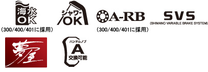 ■Super SHIP搭載 ■大径メインギヤ内蔵 ■スプールエッジ0.4mm、超々ジュラルミンを採用したブランキングスプール(50/51/100/101に採用) ■37mm径ブランキングスプール(200/201に採用) ■アルミ深溝スプール(300/400/401に採用) ■スーパーフリースプール ■超精密ワンピース・マシンカットアルミフレーム ■グリスレスとグリスインのボールベアリングを目的に応じて配置。(300/400/401は除く) ■サビに強いA-RB採用(300/400/401に採用) ■丸形でありながら低くおさまるロープロファイル設計 ■0.35mmマイクロピッチクリック付大口径精密キャストコントロールつまみ ■SVS(可変遠心力ブレーキ) ■クリック付きドラグ機構 ■カーボンドラグワッシャー ■ブレーキ力の調整、スプール脱着が可能。ダンパーを加えたフリップオープン機構 ■スプールクリック機構(300/400/401に採用) ■アシストストッパー(300/400/401に採用) ■レフトハンドル・ライトハンドル専用形状ハンドルツマミ(300/400/401除く) ■4ボールベアリング35mmレギュラーハンドル(50/51/100/101に採用) ■4ボールベアリング42mmロングパワーハンドル(200/201に採用) ■パワーフィッシング専用45mmロングパワーハンドル(300/400/401に採用) ■スペアブレーキブロック(大6個、標準6個、50サイズのみ小型サイズ2種を各6個付属) ■専用特殊チューニングオイル付 ■専用リールカバー付 カルカッタ コンクエスト